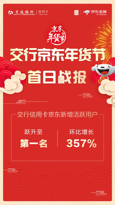 2018年1月22日,京东商城、京东支付联合交通银行信用卡中心正式开启京东年货节交行信用卡大促。今年,交通银行信用卡中心深度参与到京东年货节中,成为首个加入京东年货节的银行业合作伙伴。在京东商城、京东支付和交通银行信用卡的跨界营销助力下,年货节1月22日交行信用卡京东新增活跃用户跃升至第一名!