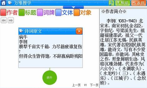 如果要了解作者李纲,就会显示如上界面,与其相关的是《病牛》,呈现绿色表示这是标题名称,右面会显示作者的简介。