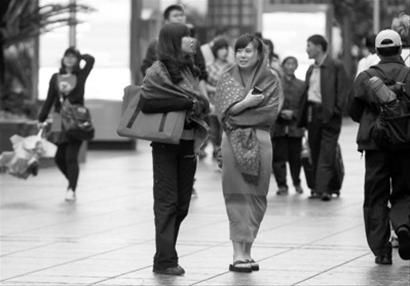 昨天,申城最高气温速降至16.5℃。许多市民披上秋装,但有些游客还是被突如其来的降温弄得措手不及。 晨报记者 殷立勤 现场图片