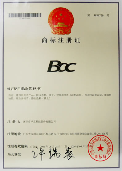 2001 年,卓宝科技自主研发生产的“贴必定”BAC自粘防水卷材通过了深圳市科技成果鉴定,并于2004年1月16日,向国家工商行政管理总局商标局(简称商标局)提出“BAC”商标申请。该商标于2006年3月28日获初步审定并公告,核定使用商品为(第19类)沥青、建筑用沥青产品、防水卷材、油膏、建筑用纸板(涂柏油的)、屋顶用沥青涂层、建筑用油毡、煤焦油沥青、路面敷料。